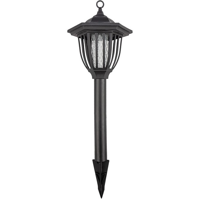 Антимоскитный садовый светильник сочетает сразу два устройства в одном: уничтожитель летающих насекомых и светильник для подсветки газонов, цветников и дорожек. Принцип действия электрического уничтожителя насекомых (комаров, мошкары) – основан на использовании ультрафиолетового излучения в специальном диапазоне (350-400 нм). Многие летающие насекомые весьма чувствительны к данному диапазону УФ-излучения и он привлекает их. Подлетая к лампе, насекомые замыкают собой прутья металлической решетки под напряжением и погибают от электрического разряда. Решетка защищена от случайного прикосновения, поэтому устройство безопасно для человека и домашних животных.