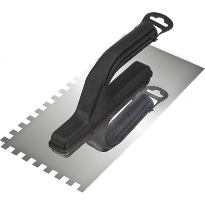 Гладилка прямая (зубчатая) изготовлена из нержавеющей стали, оснащена эргономичной пластиковой ручкой. Используется для качественного нанесения различных сухих смесей, их распределения по поверхности, а также сглаживания неровностей и швов. В ремонтных, а также отделочных работах гладилка малярная и штукатурная используется повсеместно. Она незаменима в случаях, когда необходимо нанести много раствора тонким слоем.
