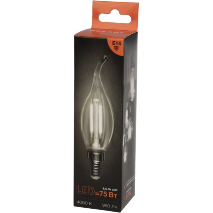 Филаментная лампа обладает характерной вытянутой формой с заостренным кончиком, напоминающим язык пламени на ветру. Имеет прозрачную колбу, которая пропускает больше света и обеспечивает высокую яркость. Мощность – 9,5Вт, цоколь – Е14.