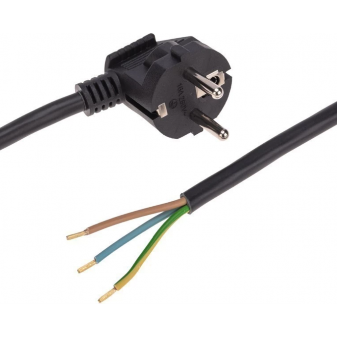 Провод ПВС сечением 3х1,5 мм² номинальным током 16 А с подготовленными (зачищенными) контактами укомплектован литой неразборной угловой вилкой (Евро).