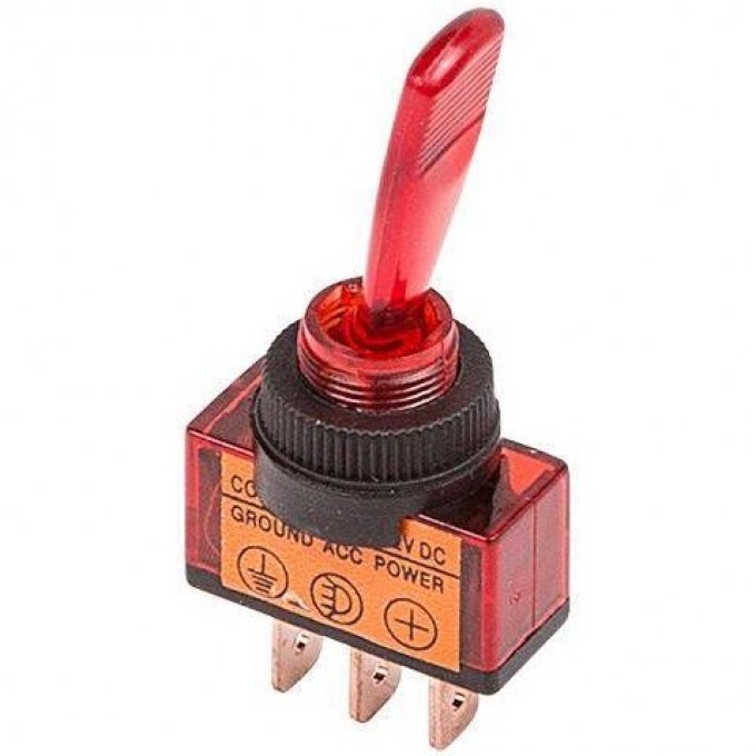 Тумблер 24V(DC) 20А (3c) ON-OFF однополюсный  с красной подсветкой предназначен для коммутации электрических цепей напряжением 24В. Такая разновидность переключателей применяется на лицевых панелях в качестве комплектующих изделий различного электрооборудования (в измерительных приборах, блоках питания, электроустановках на различных производствах, легковых и грузовых автомобилях, поездах и многих других местах). Отличительной особенностью тумблера является удлиненный (27мм) пластмассовый перекидной переключатель, принцип действия которого основан на его перемещении в одну из позиций. Для переключения в нужное положение требуется приложить некоторые усилия. Монтаж осуществляется без применения винтов на плоских панелях толщиной от 0.8мм до 4мм. Подключение контактов осуществляется с помощью плоских клемм, либо с помощью пайки.